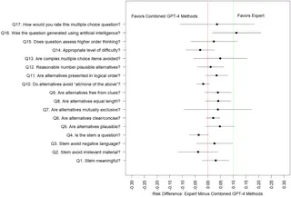 از لحاظ فنی، یکی از نکات مهم اینه که تو بعضی از معیارها، سوالای ChatGPT-4 به هیچ وجه از سوالای انسانی بدتر نبودن (حالا اصطلاح Non-inferior یعنی از لحاظ علمی قابل قبول و کمتر از ۱۰ درصد اختلاف نسبت به کار انسان)، ولی برتری خاصی هم نداشتن نسبت به سوالای انسانی.