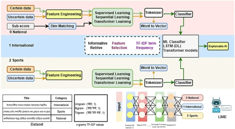 برای این تحقیق، یه سری اخبار جدید بنگالی رو از اینترنت جمعآوری کردن (خودش کلی زحمت داره چون دادههای بنگالی پر از نویز و شلوغیه)، بعد کلی پیشپردازش و مهندسی ویژگی (feature engineering یعنی انتخاب اون بخشهایی از داده که میتونن به مدل زیاد کمک کنن) روش انجام دادن تا دیتاست رو حسابی تمیز کنن.