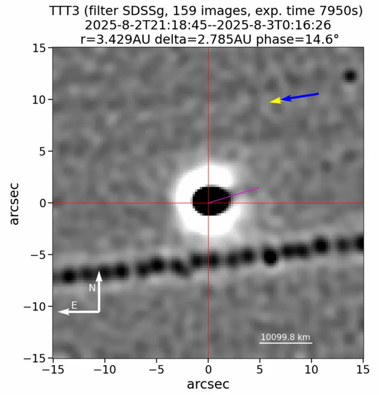 دوربینهای تلسکوپ TTT (دو متری دوقلو) تو رصدخانهی تیده تو جزایر قناری اسپانیا، تونستن تو دوم آگوست یه عکس خفن ازش بگیرن. این عکس ترکیبیه؛ یعنی دانشمندا ۱۵۹ تا عکس ۵۰ ثانیهای رو گذاشتن رو هم. وسط عکس یه نقطهی سیاه بزرگ (همون هستهی دنبالهدار) رو میبینی، دورش نور سفید هست و یه شکستگی فنمانند توی حلقهی نور نشون میده که همون جت معروفه داره با سرعت زیاد محتوا رو به سمت خورشید میفرسته. این عکس رو ۱۵ اکتبر روی سایت Astronomer’s Telegram منتشر کردن.