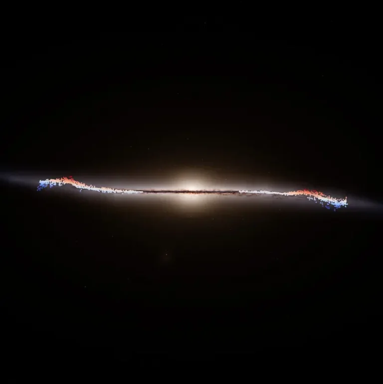 وقتی کهکشان راه شیری رو از پهلو نگاه میکنن، باز هم این موج بزرگ معلومه. حرکت ستارهها مثل پیکان (فلش)، نشون میده که این موج واقعا” کل دیسک راه شیری رو گرفته و داره جلو میره.