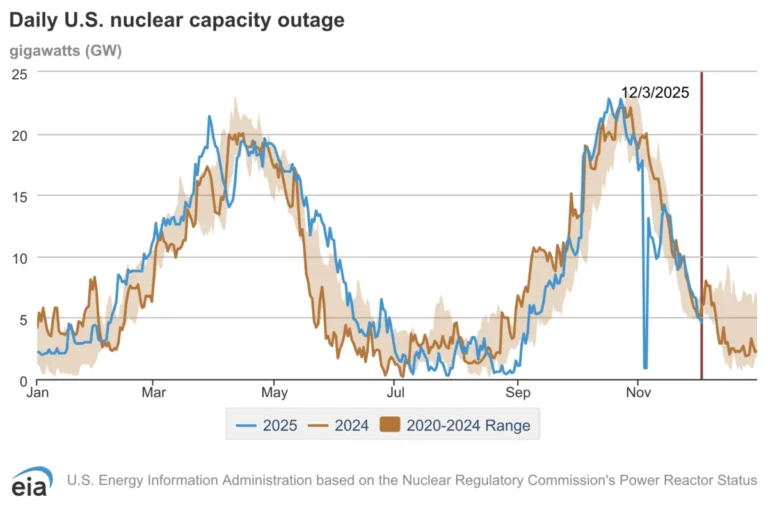 اگه به آمار اداره اطلاعات انرژی آمریکا یه نگاه بندازین، روزایی هست که تقریباً همه نیروگاههای هستهای تا ته دارن کار میکنن – مثلاً ۲۸ جولای امسال، ۹۹.۶٪ ظرفیت داشتن! ولی ۱۸ اکتبر همزمان با انجام تعمیرات و خاموشیهای برنامهریزیشده، این عدد میرسه به ۷۷.۶٪. الانم همینجوری رفتهرفته داریم میریم به سمت دوباره شلوغ شدن کار نیروگاهها چون نیاز به برق بالا رفته و دیگه تعطیلیهای عمده نیست.